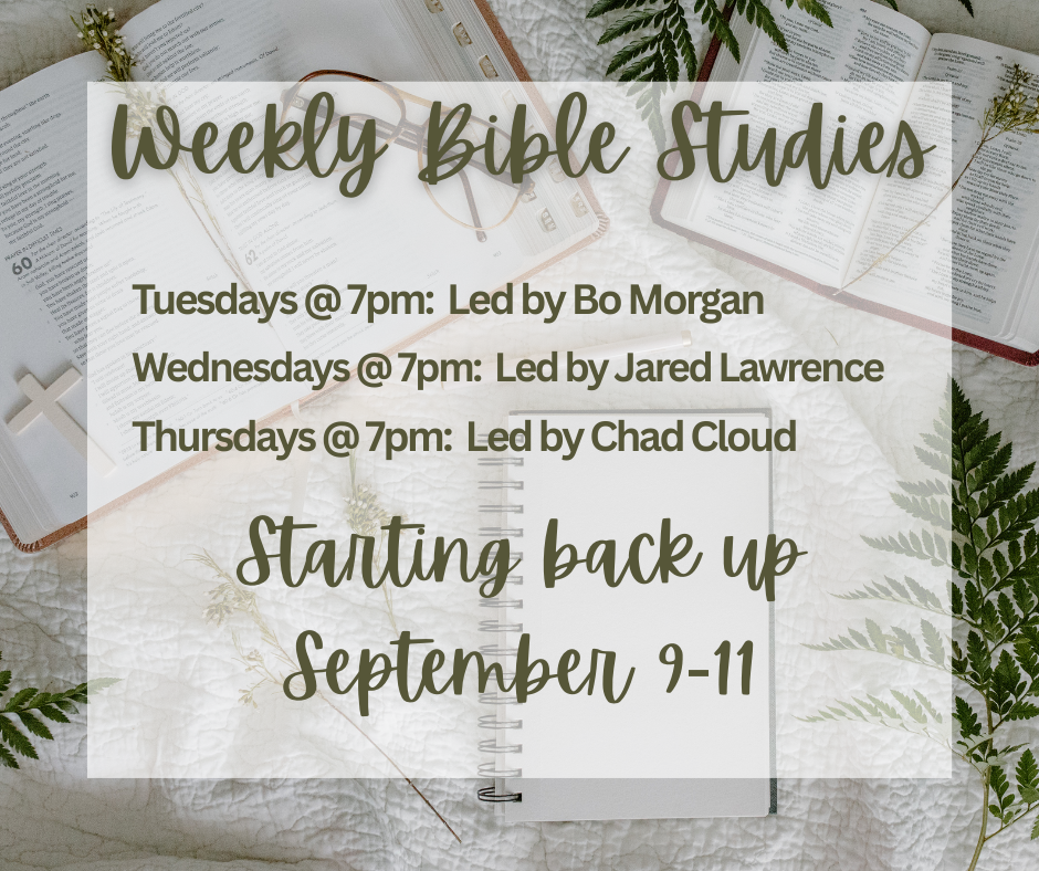 Summer break is over! Weekly Bible studies are starting back up September 9-11 at 7pm.
